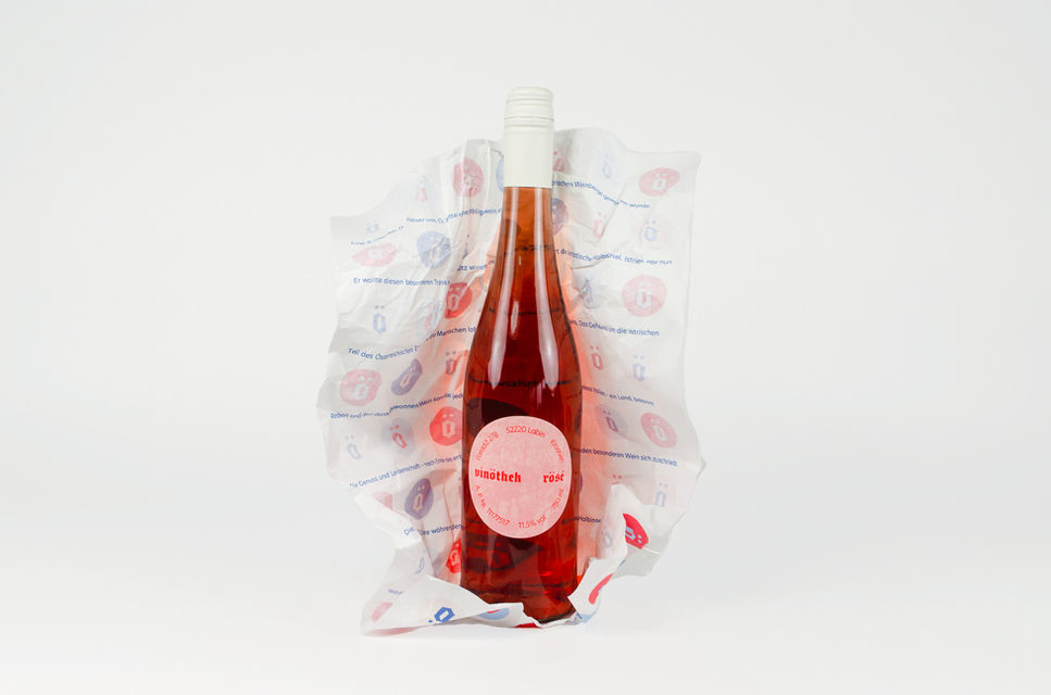 Die vinöthek baut ihren Wein in Istrien, Kroatien an. Dieser Teil des Landes ist geprägt von seiner geografischen Nähe und früheren Zugehörigkeit zu Österreich. Die Prägung wird durch das 'ö' im Namen repräsentiert und die Farben verbinden beide Landesflaggen. Runde Etikette geben organischen Bezug zu dem Ursprung des Weines, der Traube. Die Flaschen werden eingewickelt in Seidenpapier verkauft, auf der Innenseite dessen wird die humorvolle Entstehung, die Brandstory, des Weingutes kommuniziert.